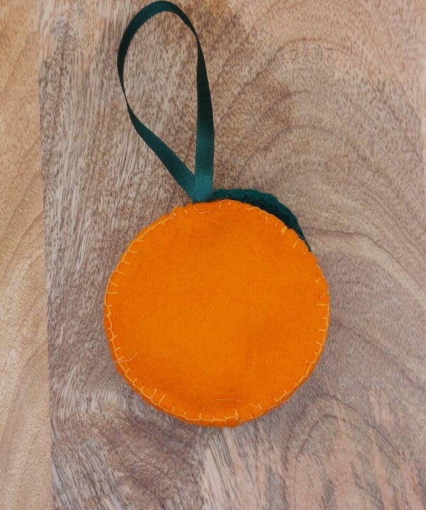 Gezellige seizoen hanger/ornament in de vorm van een een sinaasappel met blaadje waarop een kralen detail geborduurd is.