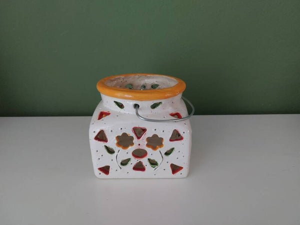 Een prachtige handgemaakte keramiek lantaarn/theelichthouder met een speciale glazuur in de kleur beige met sprankeltjes rood en oranje erdoor. de lantaarn is opengewerkt met verschillende vormen waardoor het e3n Scandinavische uitstraling krijgt.