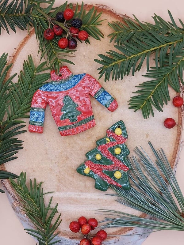 Een speciaal en gezellig kerst ornament/kersthanger in de vorm van een kersttrui, gemaakt met liefde door mij van keramiek klei, geglazuurd en gebakken.