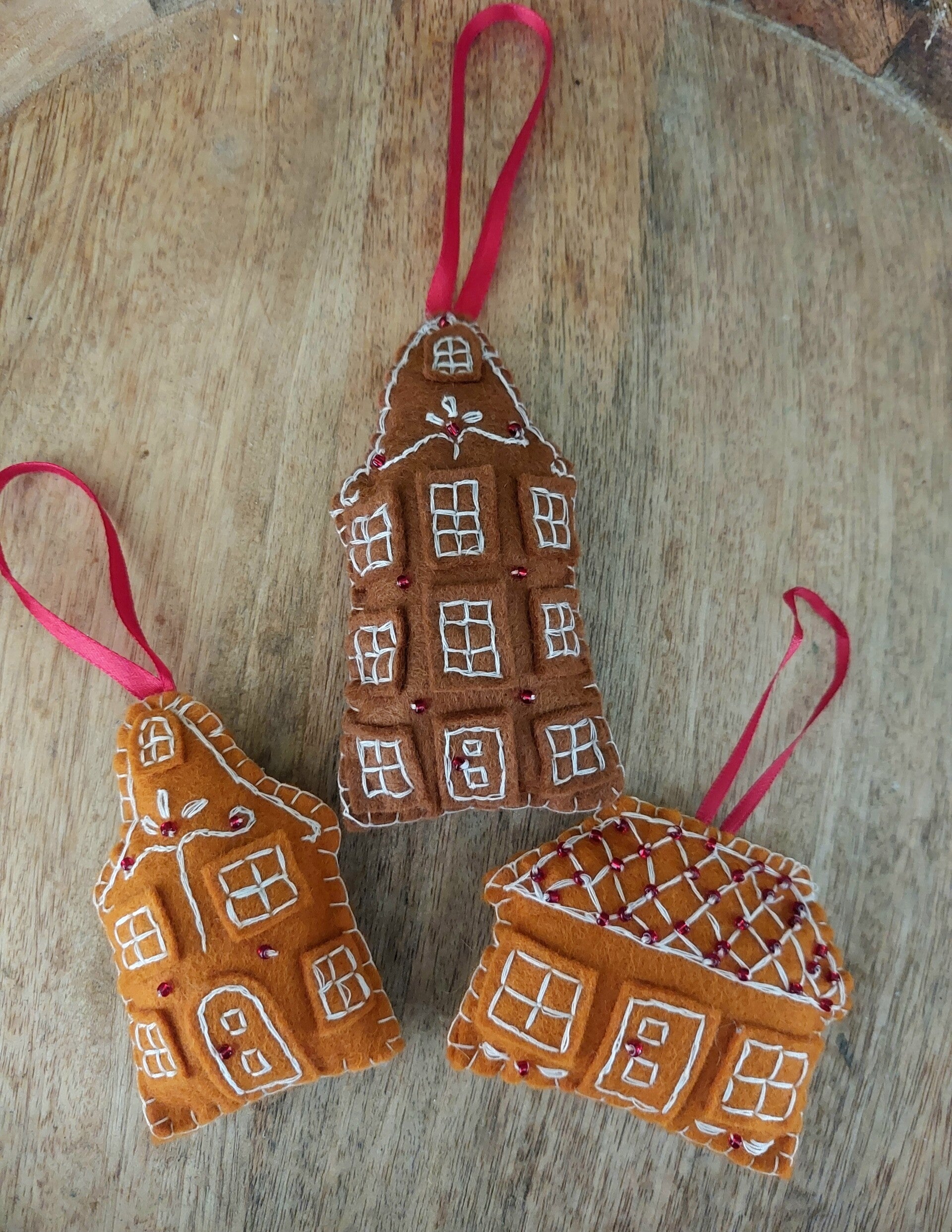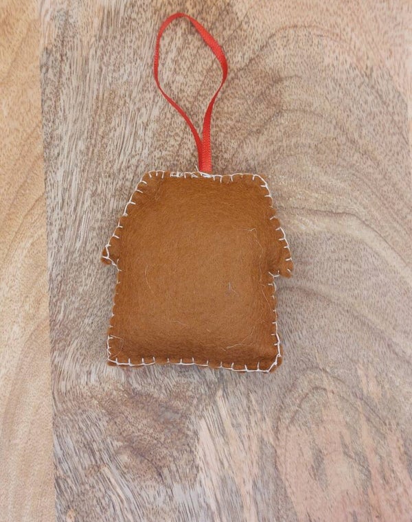 Gezellige vilten ornament/hanger in de vorm van een geborduurd gingerbread house met rode kraaltjes erop.