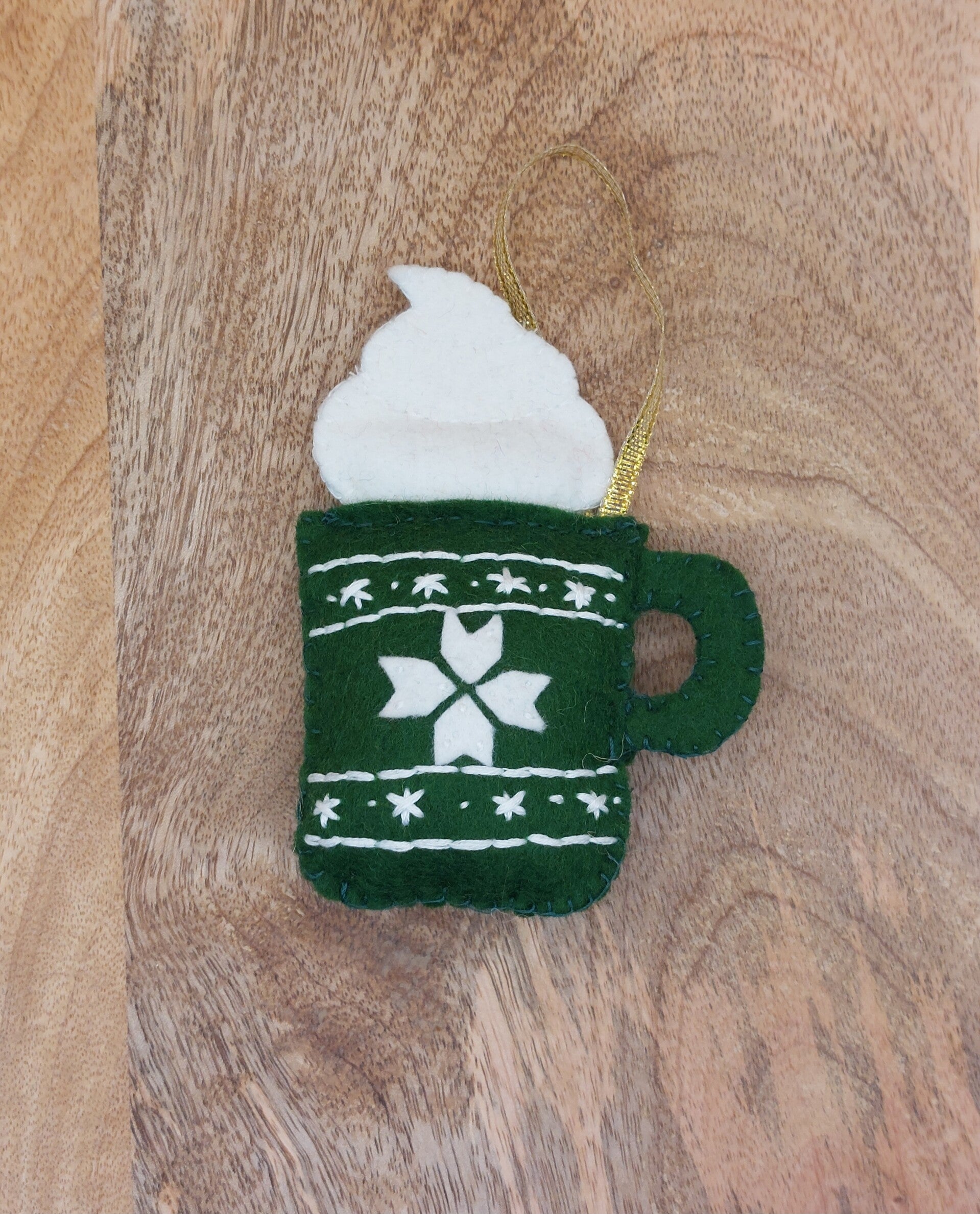 Gezellige vilten ornament/hanger in de vorm van een groene kerstmok met een toefje slagroom erop.